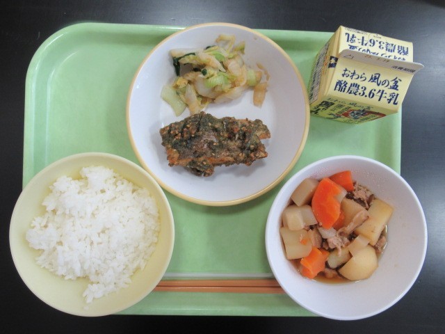 今日のメニューは、○ホキの磯辺揚げ、○生姜ひたし、○大和煮、○ごはん、○牛乳でした。