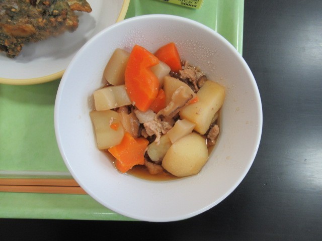 米の高騰が続いている中、米の値段がわずかに下がったというニュースや、ある都府県では、米飯給食の回数が3回から2回になるという話題が流れていました。山田小学校は、週4回のごはんと毎日おいしい主菜、副菜を食べられて幸せです。そして、大和煮には、星やハート、チューリップ、おさかな等のニンジンやこんにゃくの型抜きがいっぱい入っていました。ワクワクが入っている給食でもあります。調理員さん、いつもありがとうございます!
