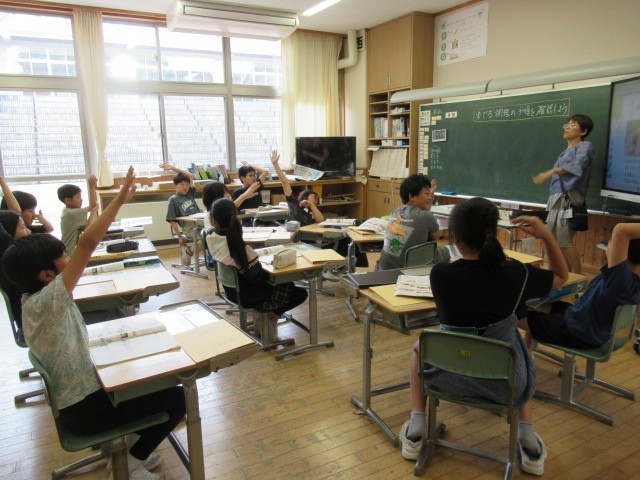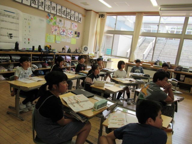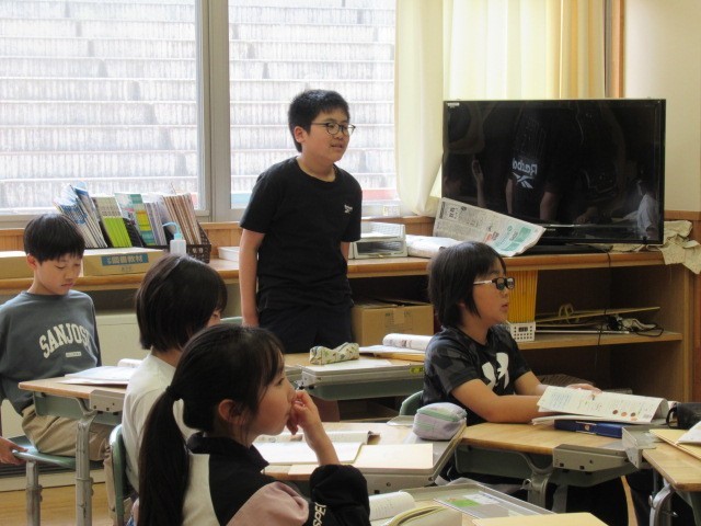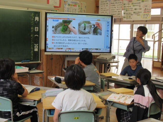調理実習はいつなのでしょう、青菜(ほうれん草?)とジャガイモの茹で方について、デジタル教科書を見ながら楽しそうに学んでいる5年生の子供たちでした。茹で上がりのほうれん草の写真を見て、「小さくなった!」と、かさの変化に気付いた子供のつぶやき、ジャガイモの芽の毒のソラニンについて話をする子供の姿がありました。残念ながら、山田特産「てんころ」は、調理実習には使えないらしいです。でも、どんなにかおいしいでしょうね。