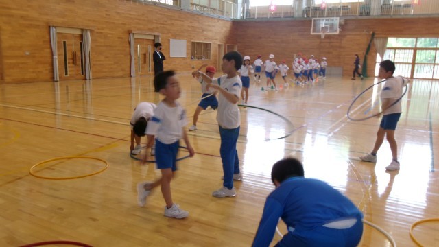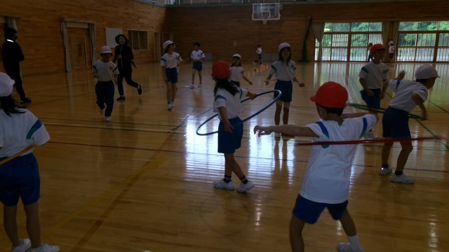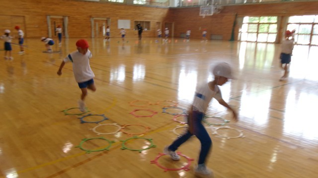 今回は、体育館でフラフープ回しやラダートレーニング、ケンステップ等に挑戦しました。