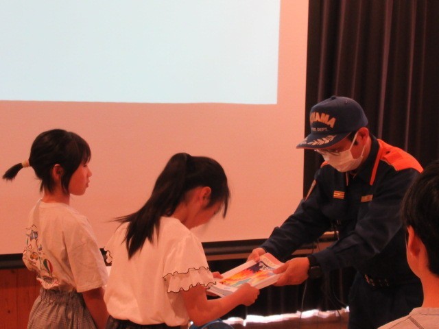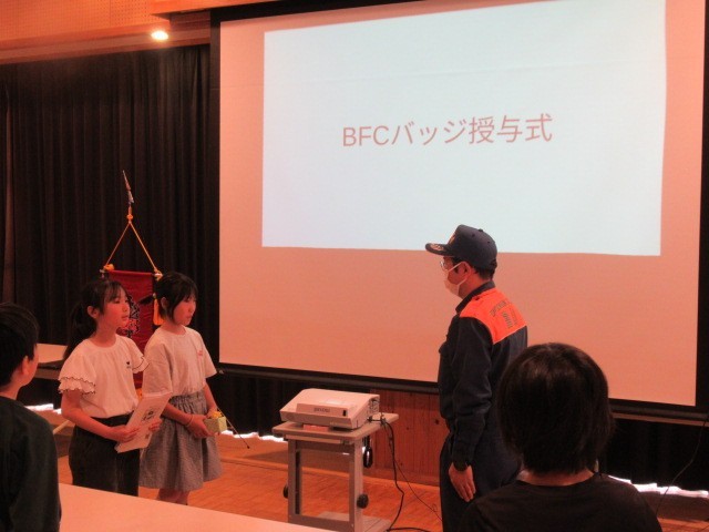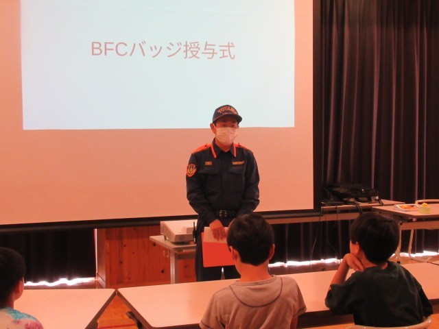 本日、富山市消防局婦中消防署の方から、5年生にBFCバッジが授与されました。少年少女消防クラブの一員となり、防災意識を高めました。