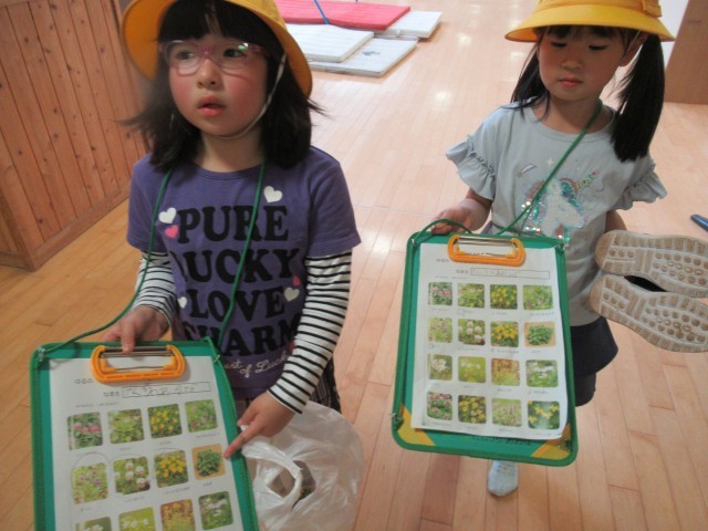 春さがしでみつけたセイヨウタンポポや草花を○で囲んだシートを紹介してくれました。