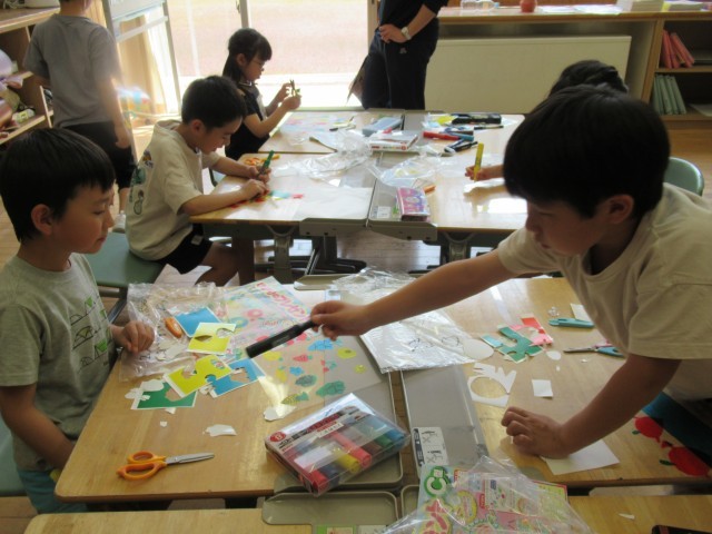 2年生の子供たちは、思い思いに好きな形を切ったり、描いたりして、楽しそうに制作に取り組んでいました。途中、光を当て、出来栄えを確認しながら工夫をする子供の姿がありました。どんなひかりのプレゼントが贈られてくるのか、楽しみですね。