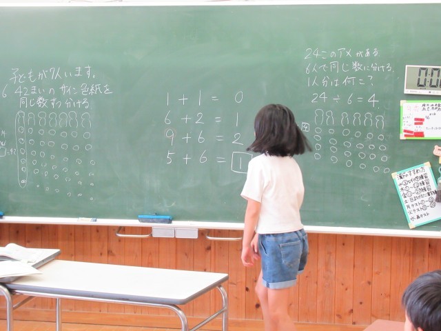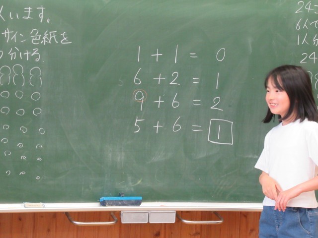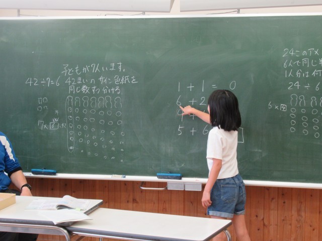 3年生は、わり算の学習が始まっています。等分除の意味について、図示しながら説明できるようになりました。先生からのおまけの問題にもパッと閃き、前に出て解答を説明してくれました。