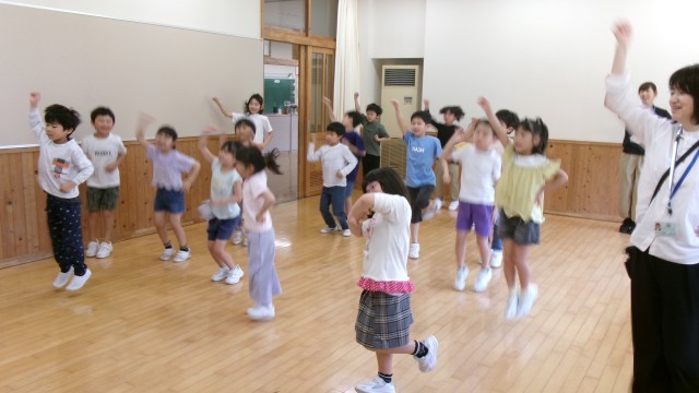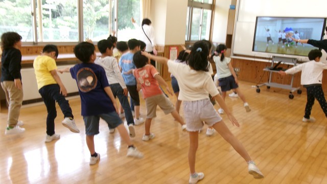 下学年はダンスです。「きときと夢体操(スポレク体操)」の曲に合わせてダンスをしました。ダンス動画に見ながら、汗をかきかき、ニコニコと踊りました。