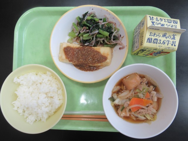 今日のメニューは、○揚げ出し豆腐のごまだれかけ、○ゆかり和え、○すきやき、○ごはん、○牛乳でした。
