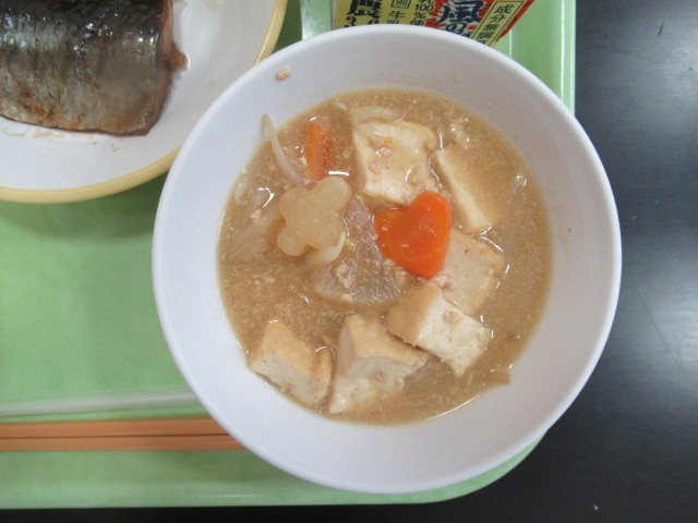 厚揚げの中華煮込みが、厚揚げや大根に味がしみしみで、白ごはんが進みました。人参や大根等の根菜は、ハートや飛行機?の型抜きがしてありました。