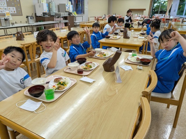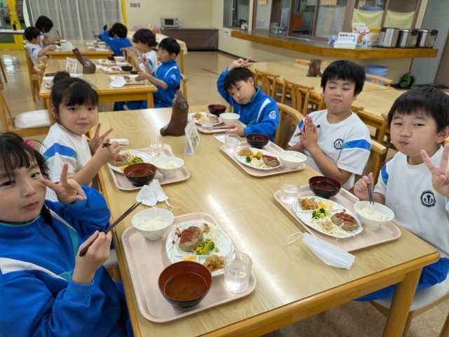 夕食タイムです。特大ハンバーグが美味しそうです。みんな元気にモリモリ食べています!