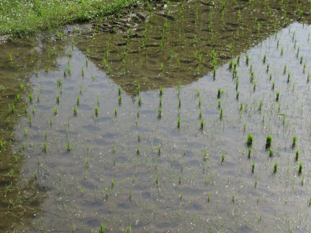 暑くなったせいか、苗の成長がよく分かります。苗の緑が濃くなり、田んぼの水面が緑っぽくなってきました。