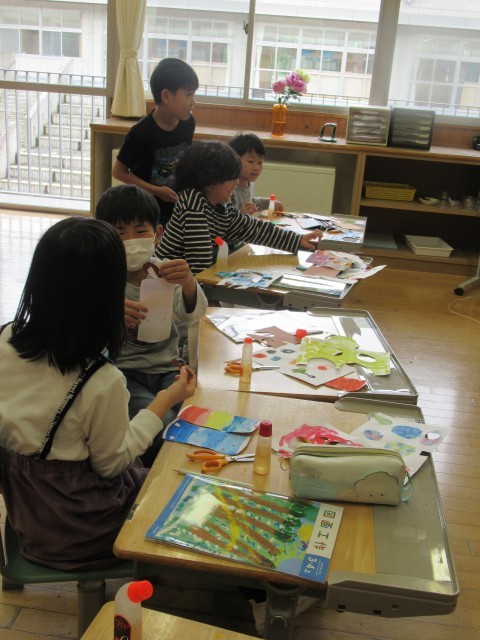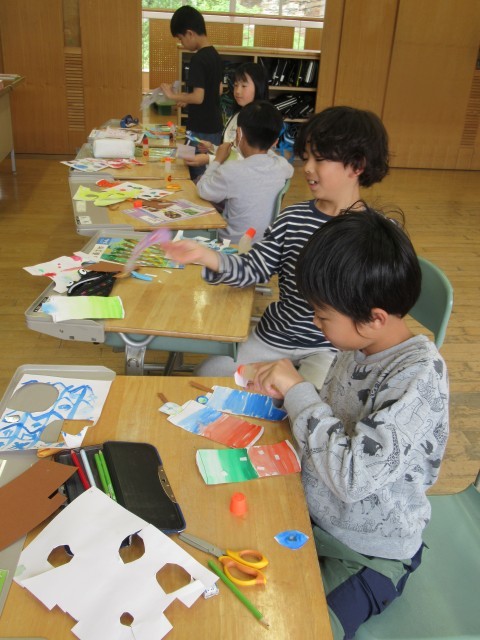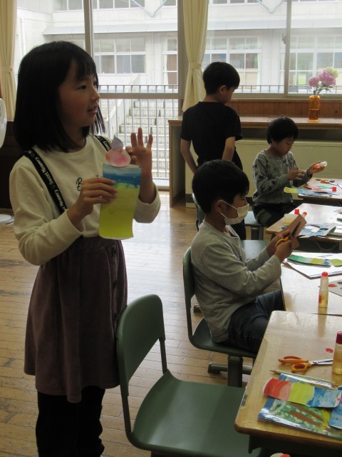 色とりどりに塗った画用紙から、カラフル、楽しい、おいしそうなジュースをイメージして制作していました。夕日が入ったようなジュース、海のようなきれいな色のジュース…。月のようなアイスクリームが入ったジュースがありました。