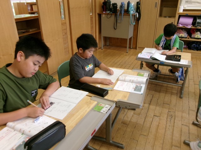 3・4年生の教室では、3年生が3けたのたし算、4年生がわり算の筆算に集中して取り組んでいました。