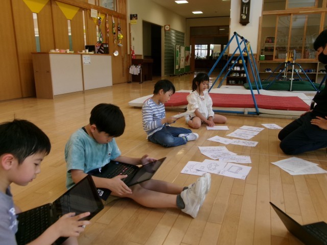 山田保育所の年長さんとの交流会に向けて準備を進めている1・2年生です。せりふの練習をしたり、年長さん役を決めて動きの確認をしたりしました。