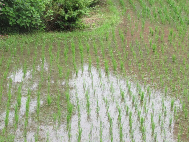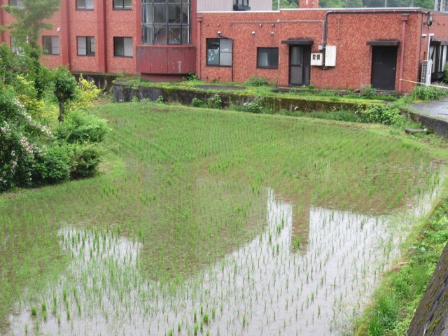 朝から雨降りの日。田んぼの水面にも雨つぶが落ちてきています。苗もしっとりしています。