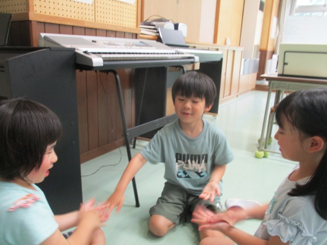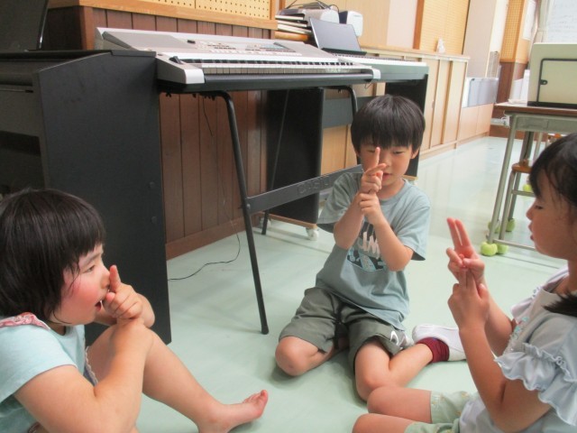 音楽の学習で手遊びうたをしました。「おてらのおしょうさん」では、保育所のときに知ったロングバージョンの歌詞で楽しみました。