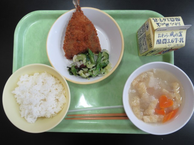 あじフライの衣がサクッサクッでおいしかったです。味噌汁が、タマネギの甘味、油揚げのうま味で、優しい味でした。