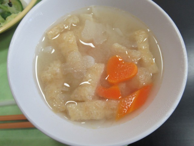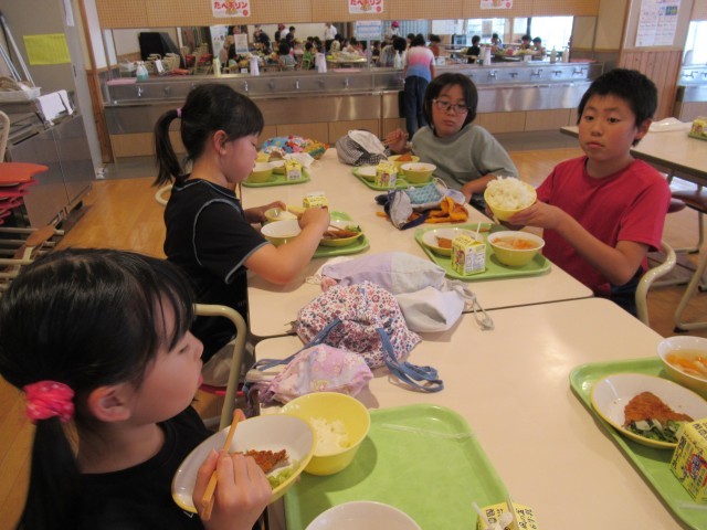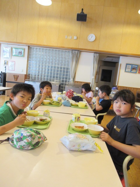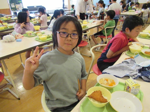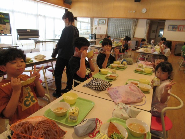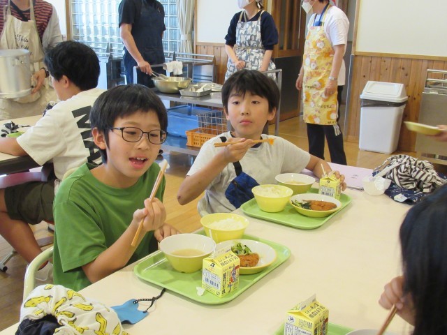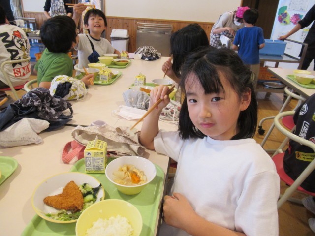 ランチルームを覗くと、子供たちが、味噌汁の中に、ハートやスペード、クローバーの型抜きの人参や大根を見つけ、楽しそうに食べていました。