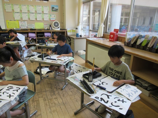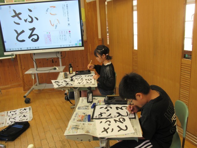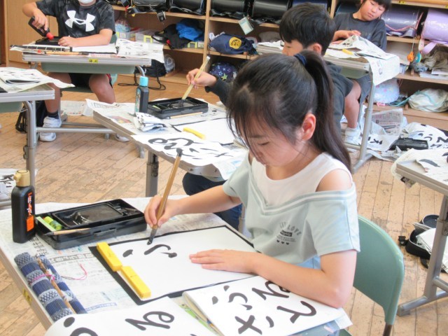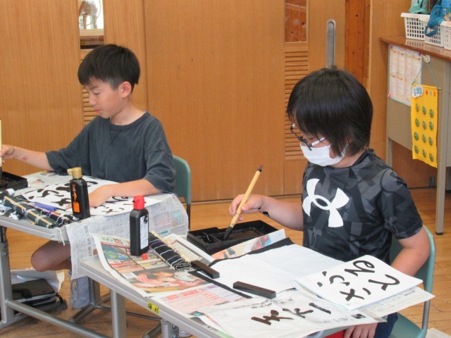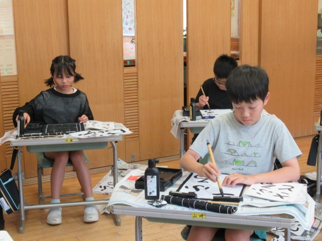「足裏ぺったん、背中はぴん。おなかとせなかにぐぅ一つ」の正しい姿勢で、集中して書に取り組んでいました。