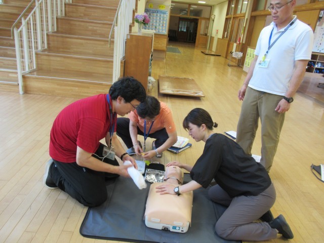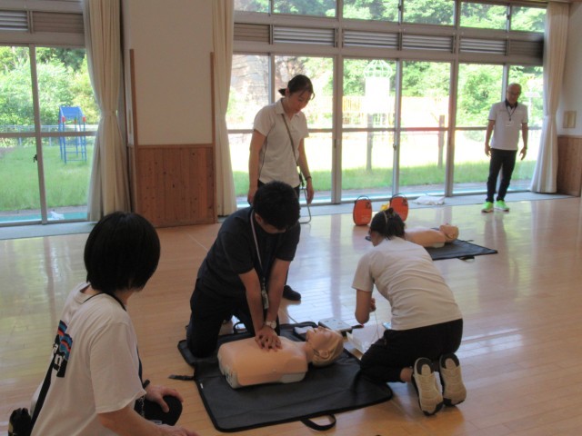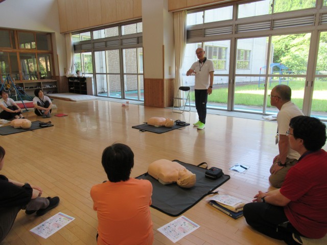 水泳学習を前に、本日は、安心・安全な時間にするために、日本赤十字社富山県支部の救急法指導員の方をお招きし、教員で救命講習を行いました。