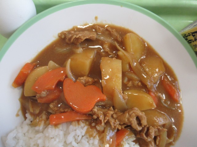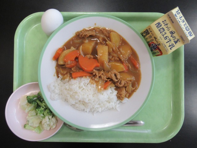 カレーに刻んだショウガが入っていて、夏バテに効きそうでした。ゆで卵が出ました。子供たち、ちゃんと殻を剥けたかな?
