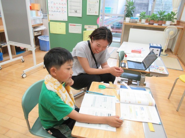 タオルを首に巻き、汗を拭きながら、ものさしの目盛りの読み方について熱心に勉強していました。
