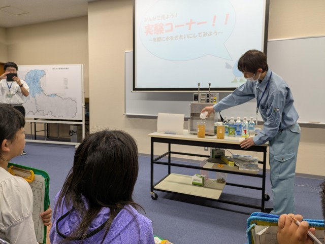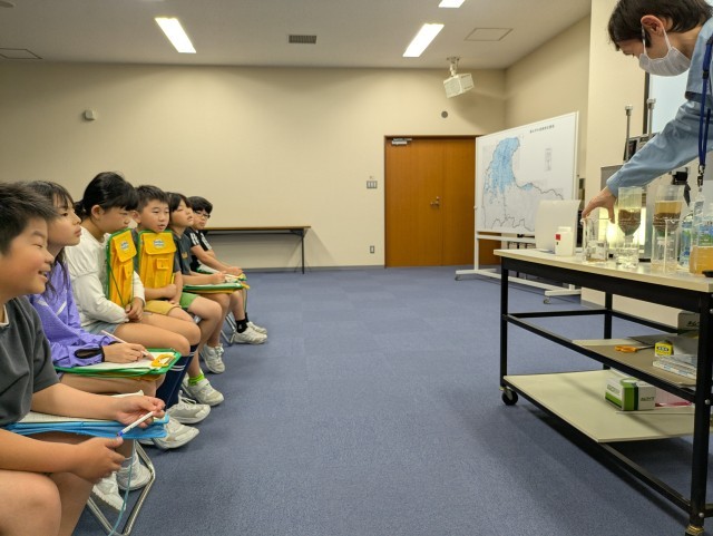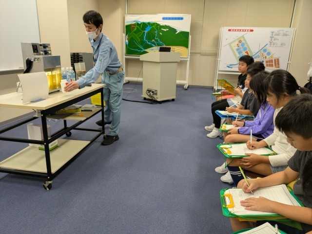 川の水にPACという薬品を入れると中の泥が固まり、さらにろ過すると水が透明になる実験を見せていだきましたた。濁った水が一気にきれいになる様子にみんなびっくりでした。