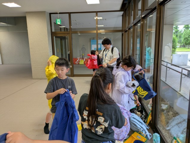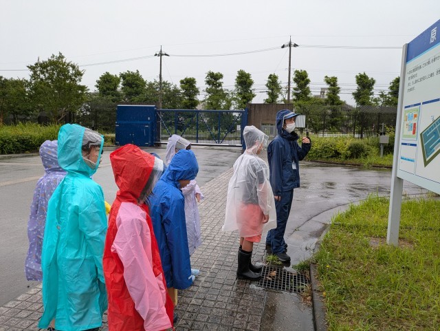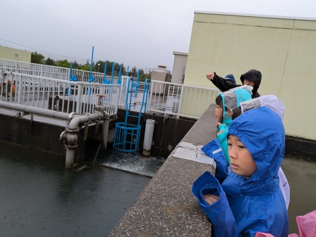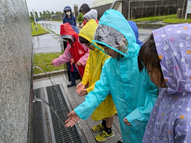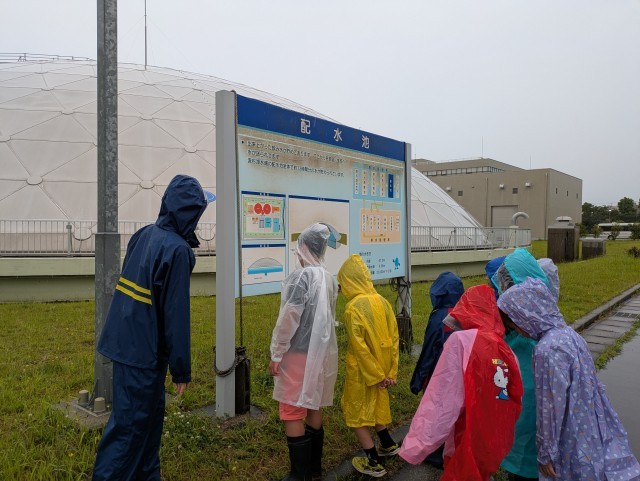 あいにくの雨でしたが、原水調整池や配水池等の浄水場の外の施設を見学しました。最後に、普段は飲むことができない流杉浄水場でできた飲料水を飲みました。できたてはサイコーと喜ぶ子供たちでした。