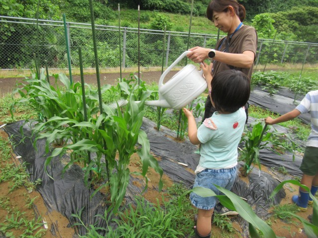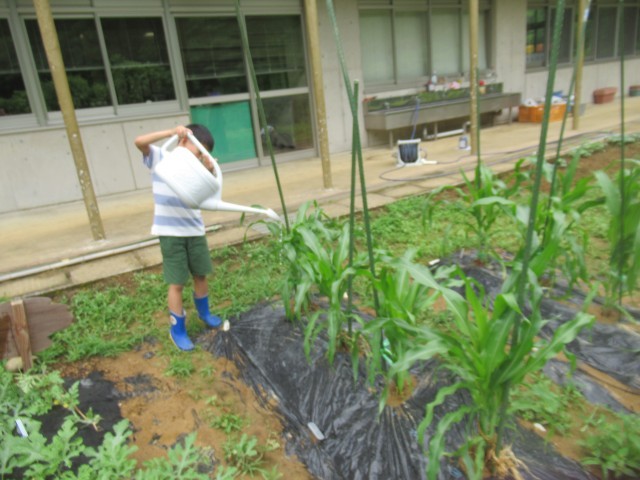 先週JAの方に教えていただいた「メリット」という肥料を手に入れ、肥料をまきました。葉の色が濃い場合は「赤」、薄い色の場合は「青」、どっちの肥料がいいかよく考えて巻きました。「土日に、おうちの人と水やりに来た」という話も嬉しそうにしてくれ、どんどん野菜への愛が深まっている子供たちです。