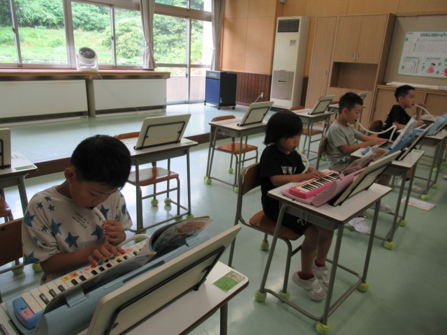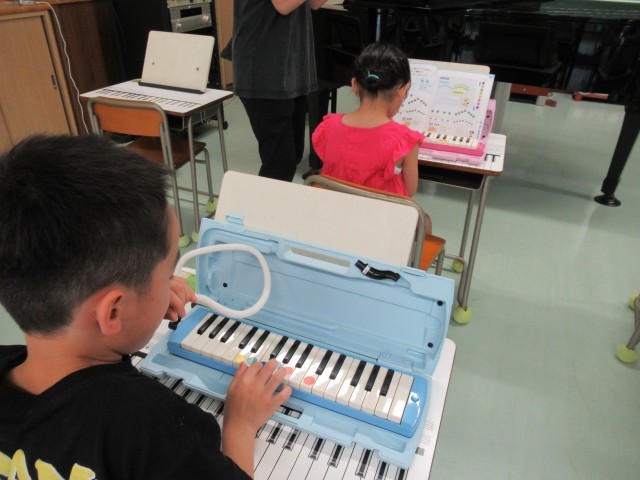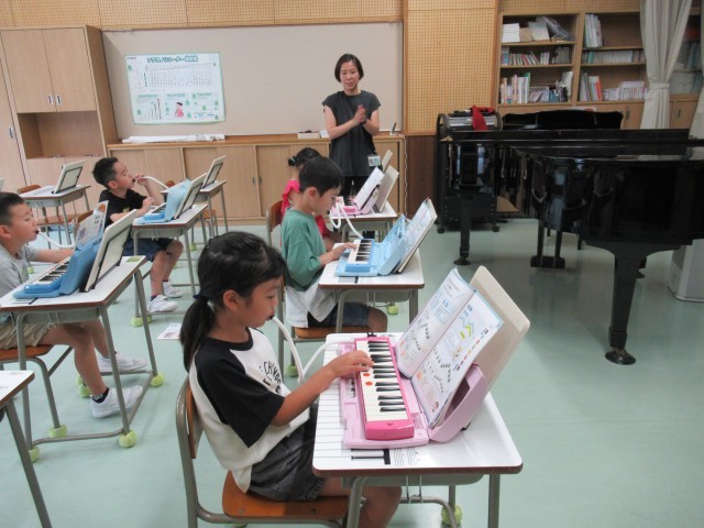 鍵盤ハーモニカで、「かえるの合唱」の追いかけっこの演奏を楽しんでいる2年生でした。