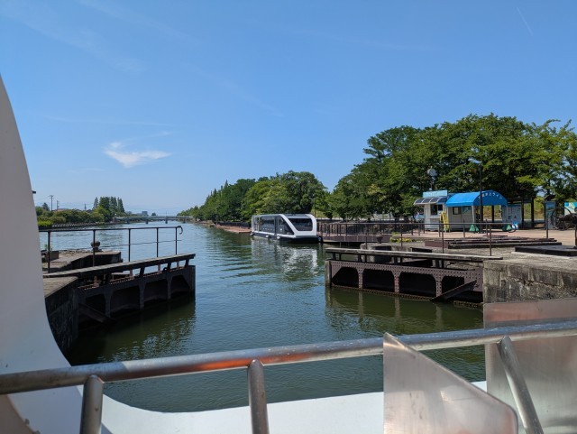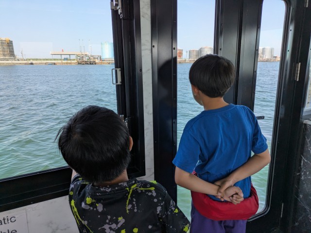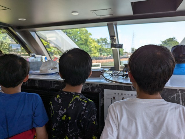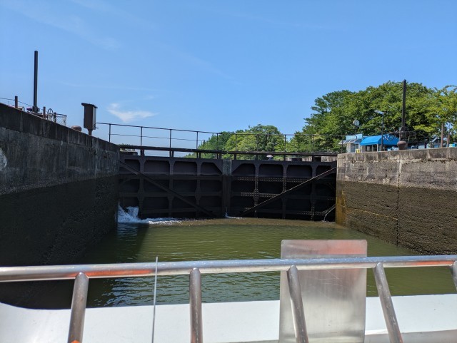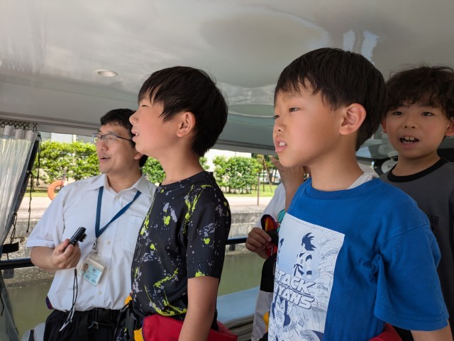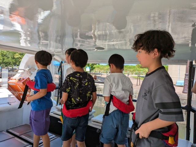 中島閘門では、水門が閉まると、水位がどんどん低くなり、海の高さと同じになりました。子供たちは、初めて見る運河からの景色に興味津々でした。