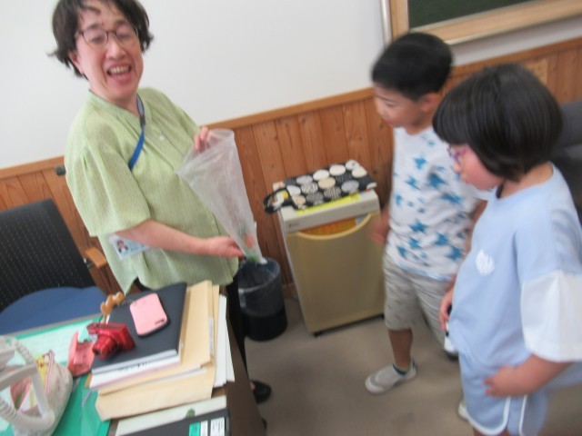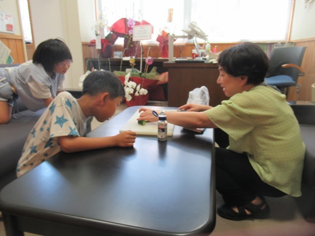 順調にトマトやキュウリの収穫ができています。先週、暑い中校長先生にトウモロコシの支柱立てを手伝っていただきました。子供たちが「このキュウリとトマトは校長先生に食べてもらう」と話し、校長室へ届けに行きました。感謝の気持ちをしっかり伝えることができました。校長先生と一緒に野菜を食べながら楽しい時間を過ごした子供たちです。