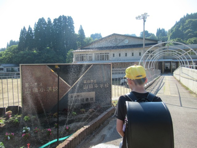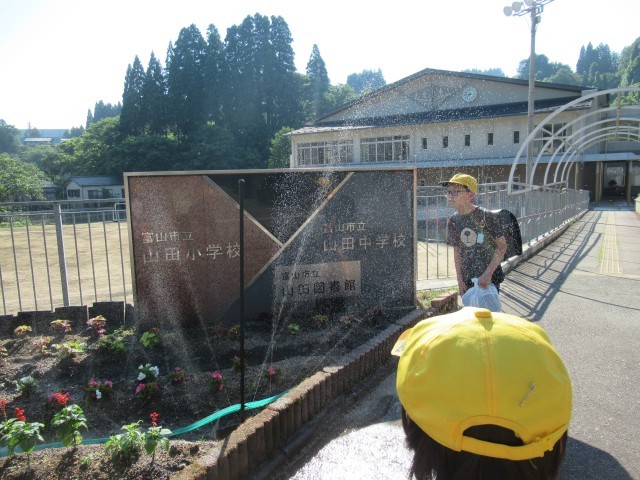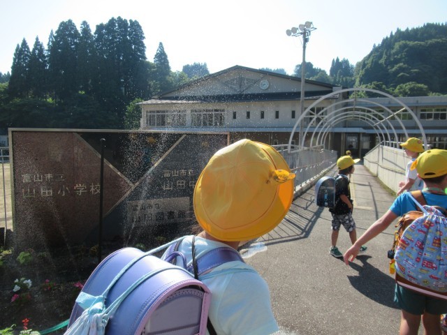 登校してきた子供たちの顔もまっ赤でした。花壇横のホースから水がミストのように噴き出していました。もちろん、花苗の水やりを兼ねてです。
