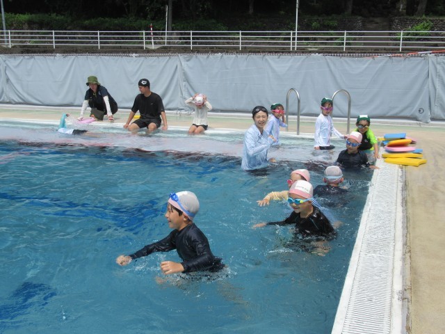 1・2年生水泳教室最終日、子供たちはこれまでの成果を発揮し、一人ずつプールの横の端から端まで泳いだり、歩いたりしました。