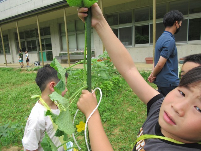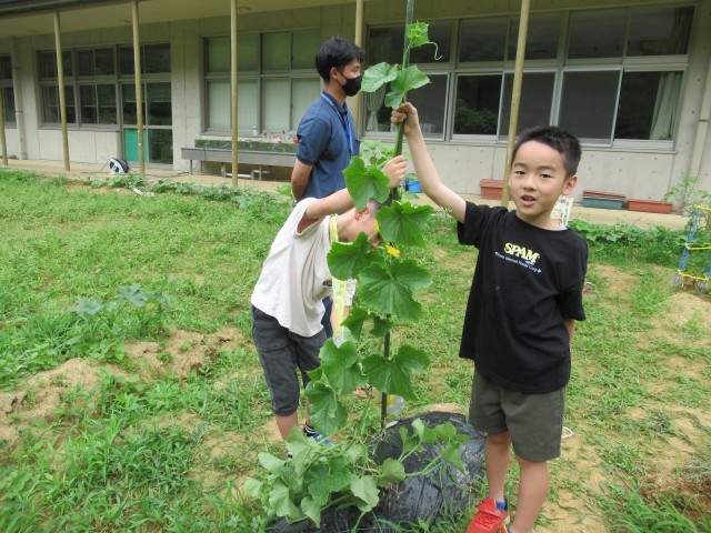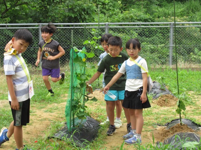 2年生の子供たちは、暑い中、農園に出て野菜の世話に取り組んでいました。