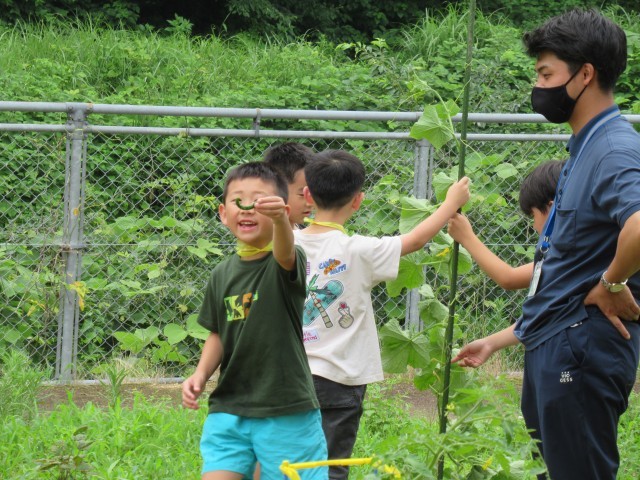 トマトに支柱を付けることができました。キュウリの支柱を太く長くして、紐でしっかり縛りました。下の方になっていたキュウリは取った方が今後の成長によいと聞き、ミニキュウリを取りました。とても嬉しそう!塩をかけたり、マヨネーズを付けたり…、収穫した子供は食べるのを楽しみにして帰りました。