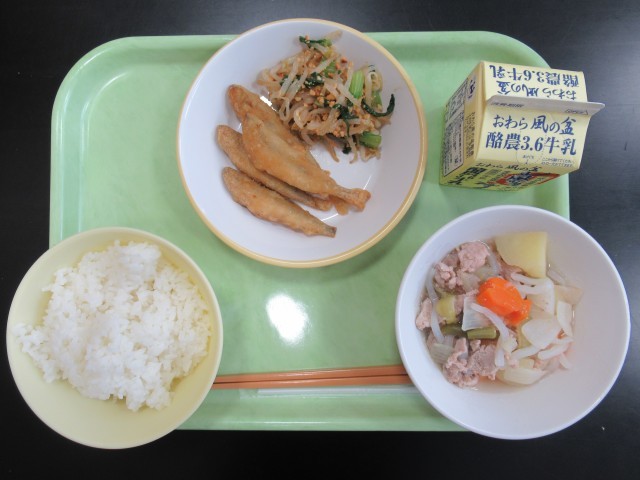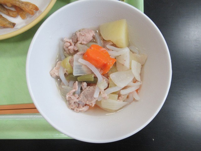 塩肉じゃがは、さっぱりしていて、夏に食べやすいと思いました。わかさぎのフリッターみたいな、型抜きした人参のお魚が入っていました。