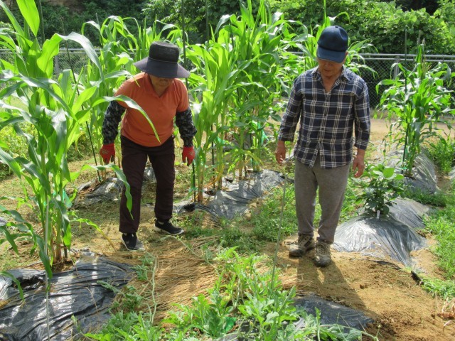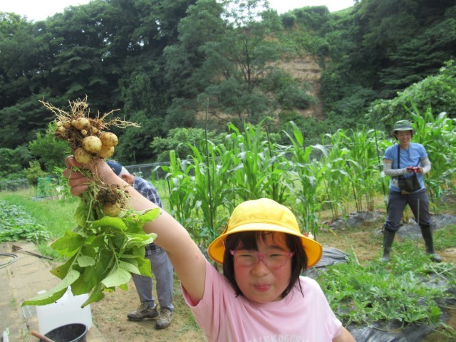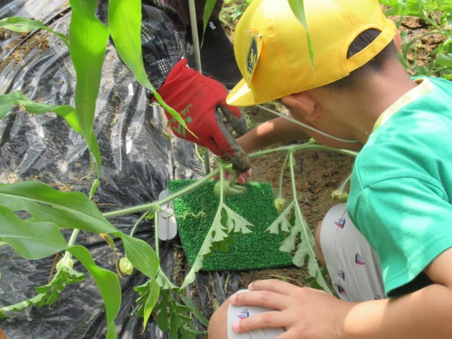 つき始めたスイカのかわいい実に座布団を敷くこと、すぐ隣の畝のジャガイモを収穫して、つるが広々と伸びやすいようにすること、つるの下に藁を敷くこと等、たくさん教わり、実際にしてくださいました。野菜が食べごろになったら現れるハクビシン除けの網も張り巡らせてくださいました。もう、何とお礼を申し上げてよいのやら分かりません。本当にありがとうございました。