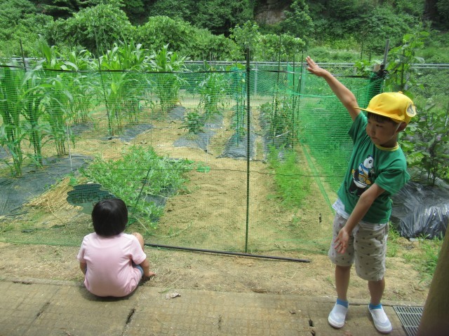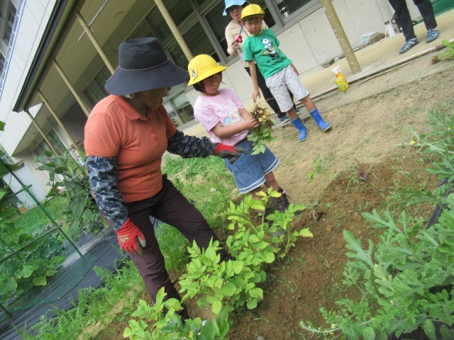 今日は、地域の野菜の名人さんに学校に来ていただきました。スイカの実が少し大きくなり、マットや藁でふとんを敷くことを教えていただきました。また、ジャガイモを収穫し、スイカのつるを伸ばす場所を空けました。野菜名人さんは、子供たちが教室に戻った後も、草むしりや肥料まき、動物対策のネットを張ってくださいました。子供たちだけでは、ここまではできません。給食後、畑に行った子供たちは「すごい!」「今日は嬉しい日だ!」と大喜びでした。暑い中、本当にありがとうございました。