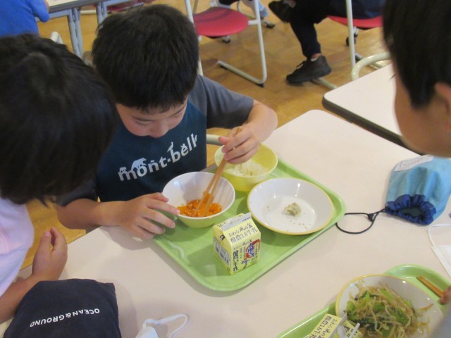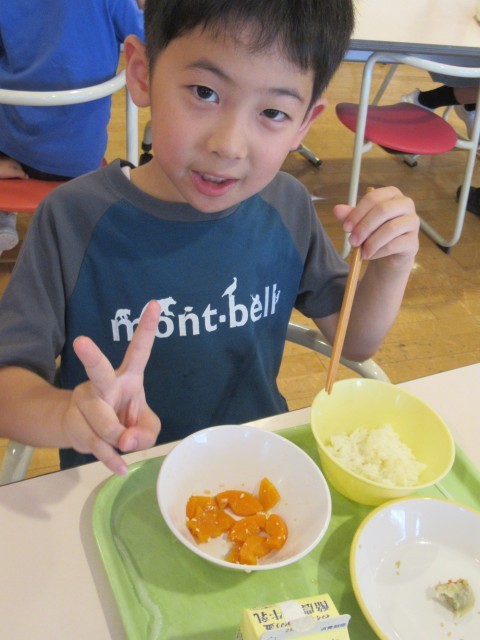 今日の給食の一コマです。「見て、見て!」という子の給食をみんなでのぞき込みました。えびと豆腐のうま煮の中に大量の魚型のニンジンがいるではありませんか。毎日型抜き野菜が入っていることを楽しみにしている子供たちですが、ここまでたくさん入っていたのは初めて見ました。七夕の日にラッキーな給食でした。いつも美味しく楽しい給食をありがとうございます。