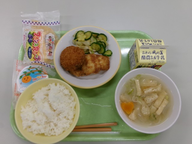 今日は、メンチカツかホキの竜田揚げ、みかんゼリーかブルーベリーのクレープを選べる選択献立でした。