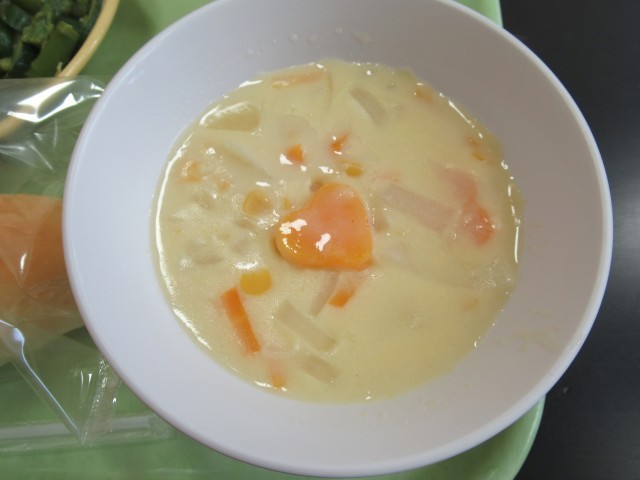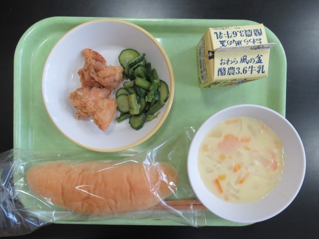給食のから揚げは、どうしてこんなにおいしいのか…。以前、調理員さんにレシピを聞いて家でも挑戦したことがありましたが、やはりこんなにうまいから揚げにはなりませんでした。フライヤーなのか、米粉なのか、下味のコンソメ顆粒なのか…。今日も暑さの中、たくさんの鶏肉を揚げてくださってありがとうございました。子供たちは、おいしそうに食べていました。