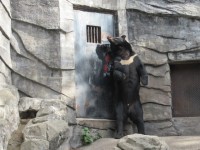 クマがいました。ツキノワグマです。二本足で立っている姿は、とても大きく、胸筋も...