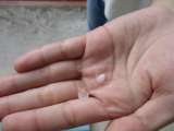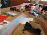 キリを使ってひも穴を作り通しました。作品名を書いたり、ニスを塗ったりして完成で...