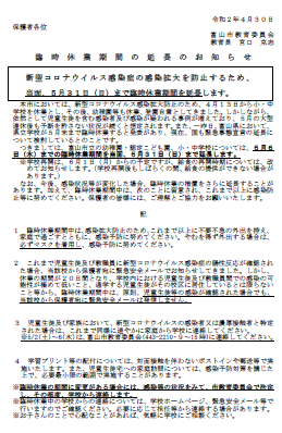 本市小・中学生が、臨時休業期間中にマスクを着用せずに外出しているなどの連絡が富山...