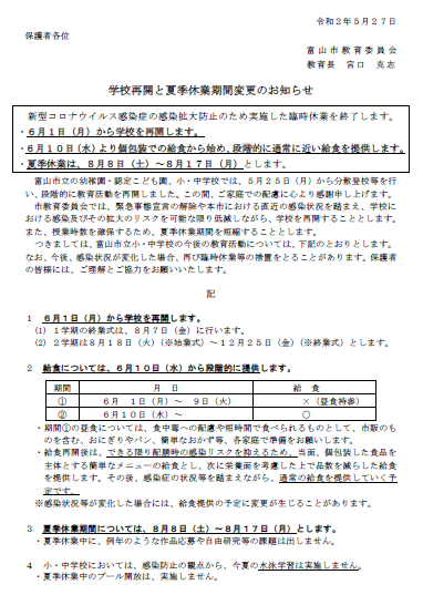 富山市教育委員会から、学校再開についての通知がありました。本ホームページの配布...