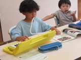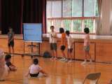 1,2年生は、パスをつないで積み上げた段ボール箱を倒すボールゲーム。3,4年生は...