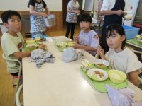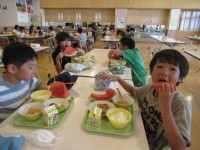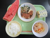 本日最後に、みんなでそろってスイカを食べました。先日いただいたスイカです。給食...