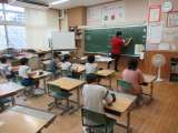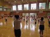 小中合同で、ラジオ体操の練習を行いました。担当の先生から動きのポイントを聞き、意...
