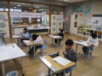 書写の様子です。今週から硬筆墨をつかった、書初の練習をはじました。手本をなぞって感覚をつかんだり、自分で手本を見ながら書いたりしながら、少しずつ練習に取り組んでいます。