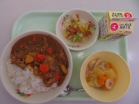 今日の献立は、ごはん、牛乳、豚肉と豆のハニーマスタードソースからめ、花野菜サラダ、きらきらぼしスープ、お茶プリンです。今日は、「メロディ献立」です。きらきらぼしスープは、夜空に輝く星を「オクラ」で、夜...