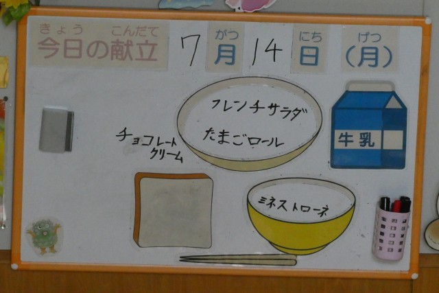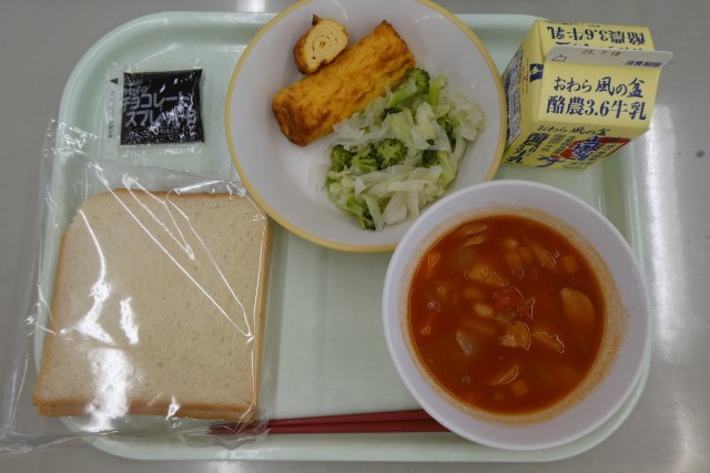 今日の献立は、食パン、チョコレートクリーム、牛乳、ミネストローネ、フレンチサラダ、卵ロールです。